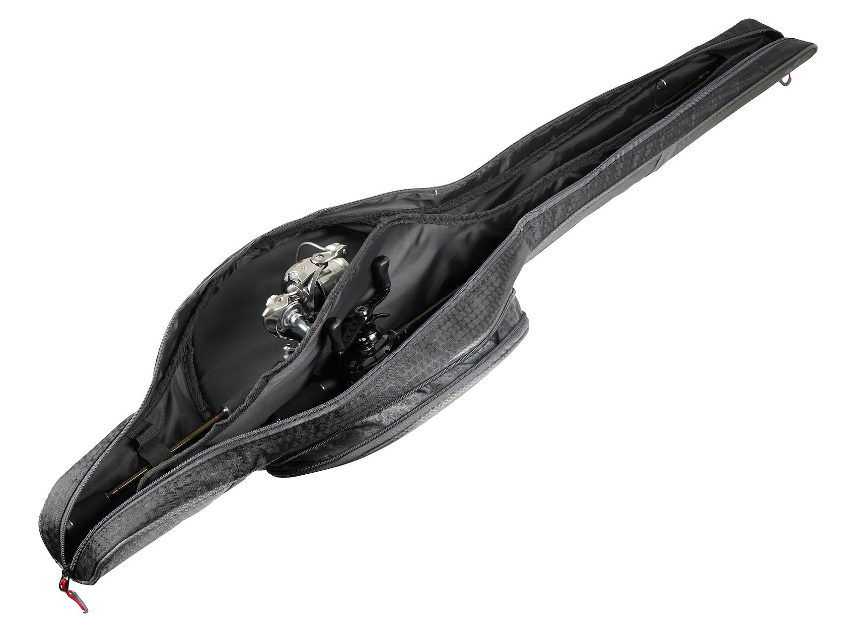 Цей міцний чохол забезпечує чудовий захист завдяки м’якій внутрішній обробці, що дозволяє зберігати дві вудки та котушки, забезпечуючи їхню безпеку та запобігаючи заплутуванню під час транспортування.