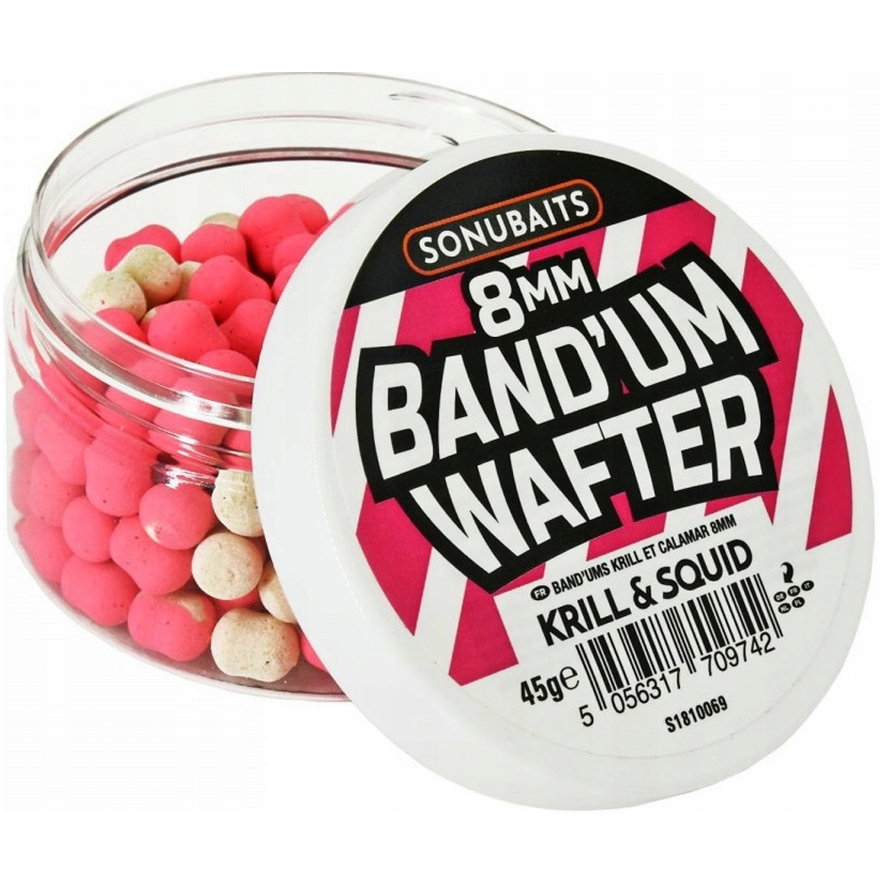 Наживки типу Wafters з нейтральною плавучістю. Доступний у трьох розмірах: 6,8 і 10 мм, а також у багатьох ароматичних версіях. Sonubaits Band’um Wafters є одними з найефективніших приманок, які використовуються в Method Feeder.